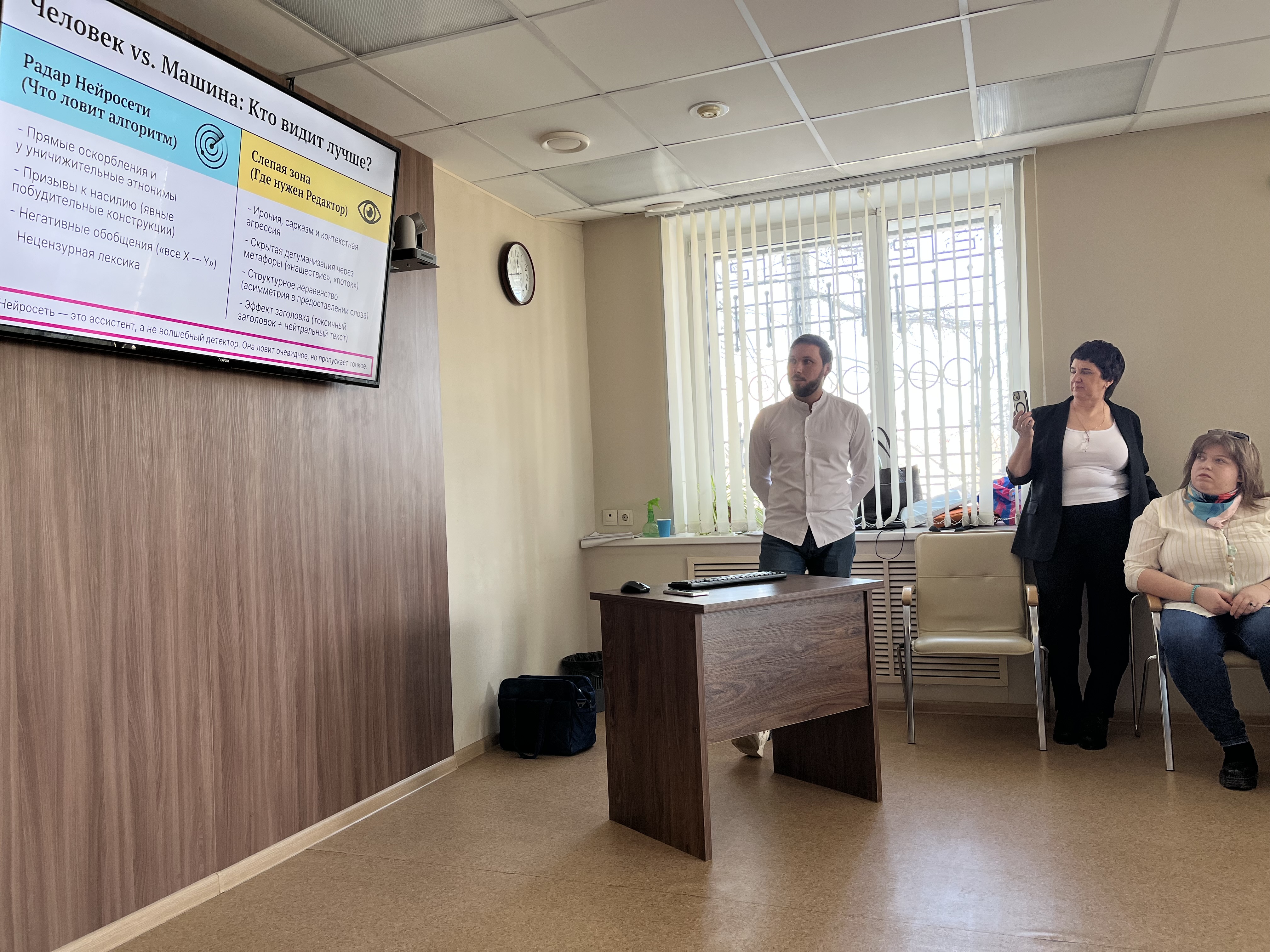 Провел занятие Сергей Бредихин, кандидат философских наук, доцент ЮУрГУ, заведующий сектором НИЦ мониторинга и профилактики деструктивных проявлений в образовательной среде. Представители СМИ из разных районов и городов области рассмотрели несколько конкретных текстов и ситуаций, а также получили советы по использованию нейросетей для выявления опасных лексических конструкций и создания безопасного контента.